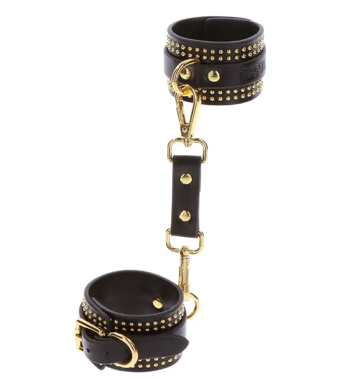 Ένα ποιοτικό και πολυτελές bdsm ερωτικό αξεσουάρ, σε μαύρο με λεπτομέρειες χρυσά καρφιά. Δυναμικό και γοητευτικό δέσιμο, αυτές οι μανσέτες αστραγάλου είναι ιδανικές για τους λάτρεις των φετίχ παιχνιδιών.